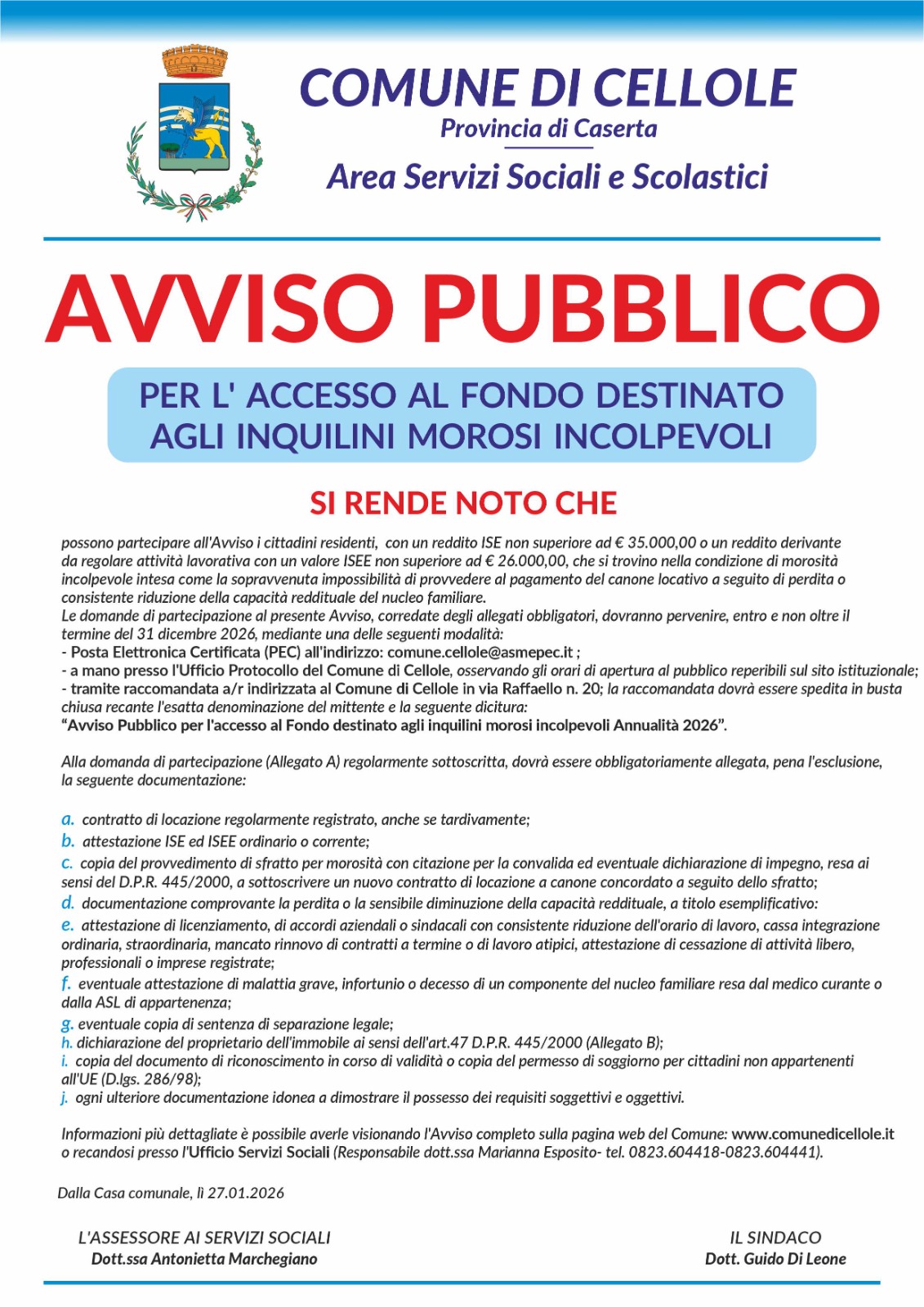 • Tramite raccomandata a/r indirizzata al Comune di Cellole in via Raffaello n. 20; la raccomandata dovrà essere spedita in busta chiusa recante l'esatta denominazione del mittente e la seguente dicitura: "Avviso Pubblico per l'accesso al Fondo destinato agli inquilini morosi incolpevoli Annualità 2026".